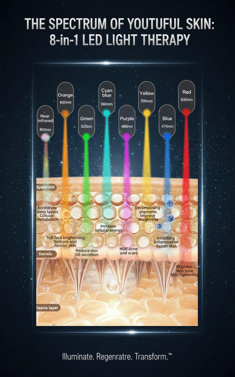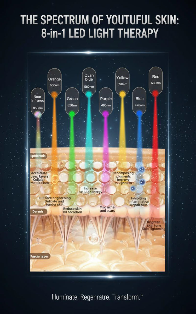 LED light therapy uses colored lights to stimulate skin cells, boosting collagen production, reducing inflammation, and targeting acne-causing bacteria.